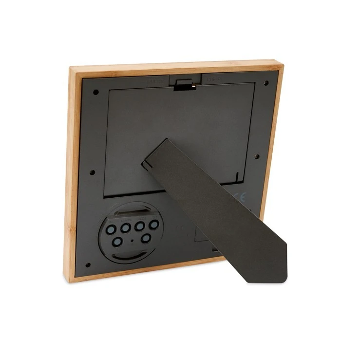 Bilderrahmen mit Tischuhr. Die Uhr zeigt Zeit, Datum und Temperatur an. Mit Alarmfunktion und Countdown-Timer. Exkl. 2 AAA-Batterien. Da Bambus ein natürliches Material ist, kann der Farbton pro Artikel variieren.