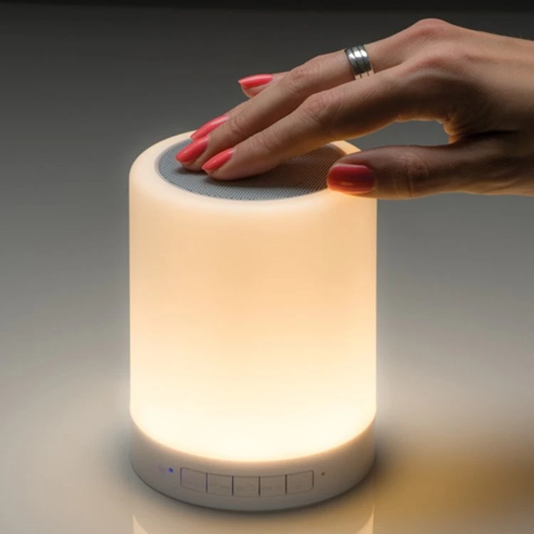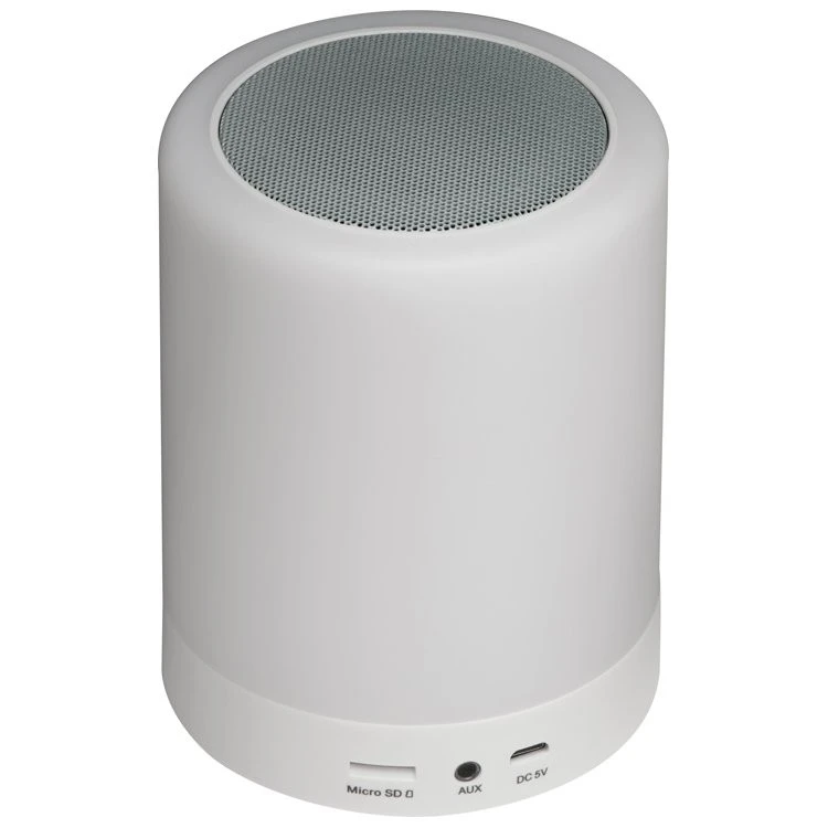 Bluetooth Lautsprecher mit wechselnder Beleuchtung, USB-Anschluss zum Aufladen und integriertem Radio. Mit einer Reichweite von bis zu 10 Meteren und einer Laufzeit von 2 Stunden. Ihre Werbung wird auf den Körper gedruckt.