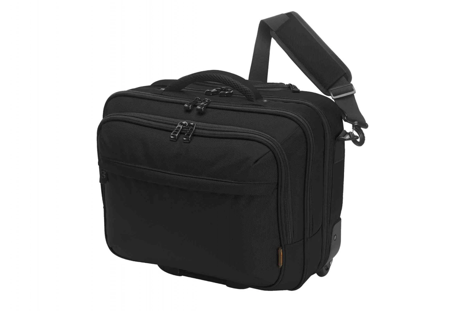 aufwändig gepolsterter Laptop-Trolley, Reißverschlussfach für Notebook; Dokumenten-Reißverschlussfach mit Separation; Reißverschluss-Vortasche mit Organizer-Elementen; Reißverschluss-Vortasche; Handgriff; abnehmbarer, zweiseitig längenverstellbarer Schultergurt mit genähtem Schulterpolster; rückseitige Befestigungsschlaufe für Gepäck-Trolley; Teleskopgriff