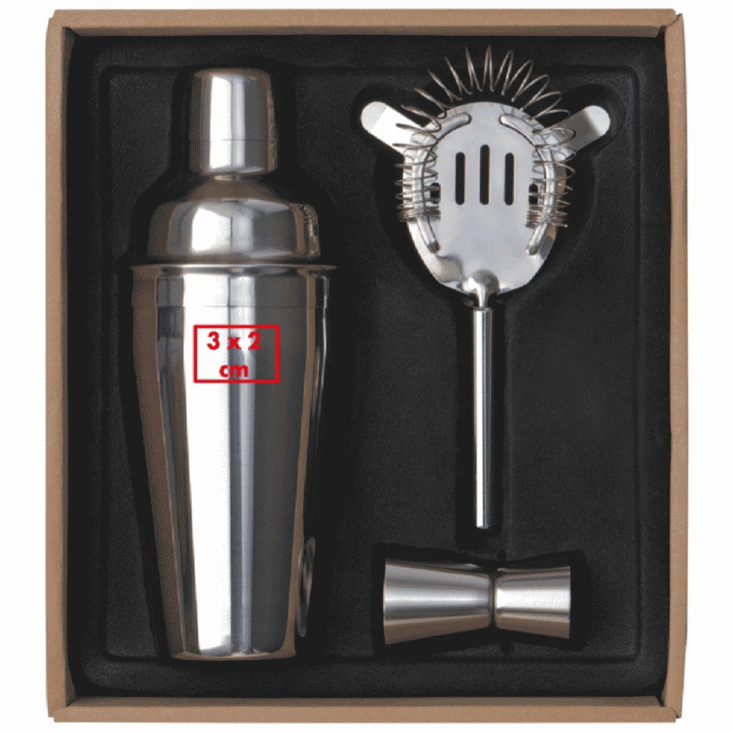 Cocktail-Set verchromt 3-teilig in Box* mit transparentem Deckel. Shaker, Messbecher und Sieb beinhaltet dieses Set. Ihr Logo wird mittels Lasergravur auf dem Shaker im oberen Drittel angebracht.