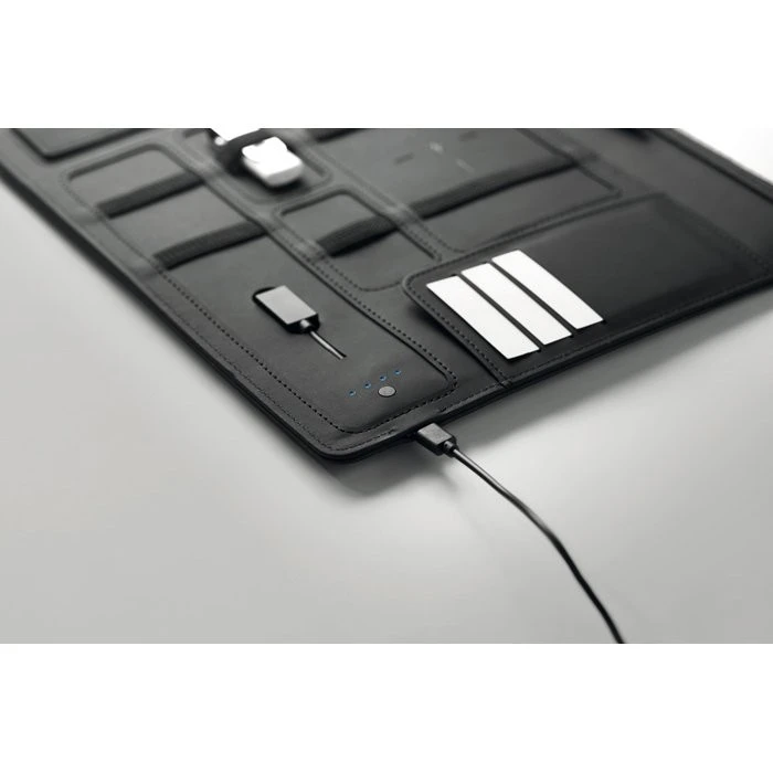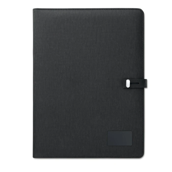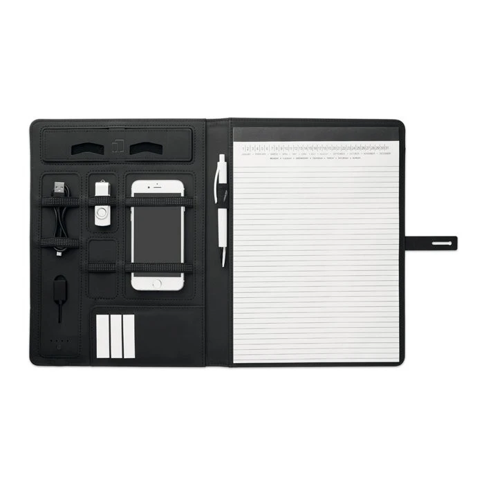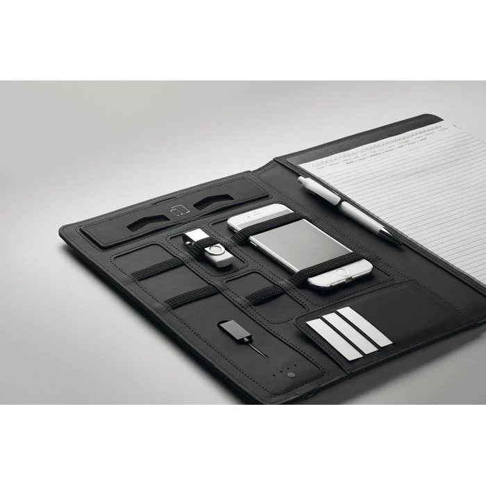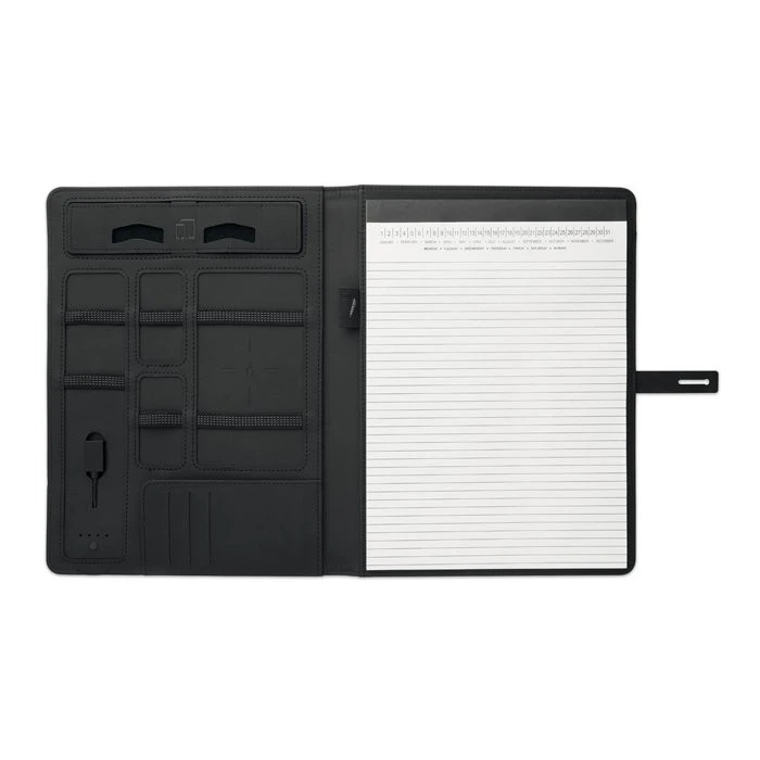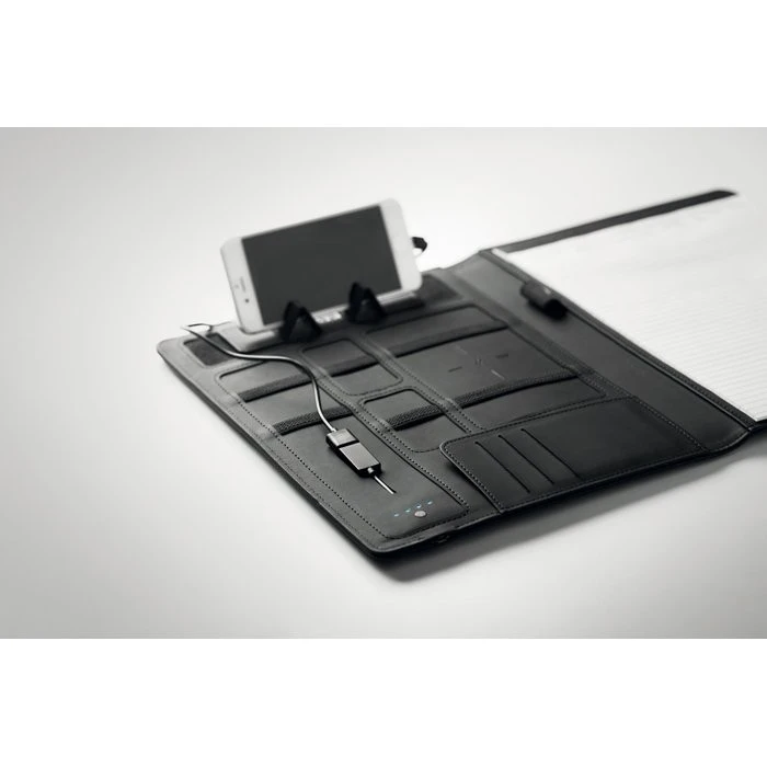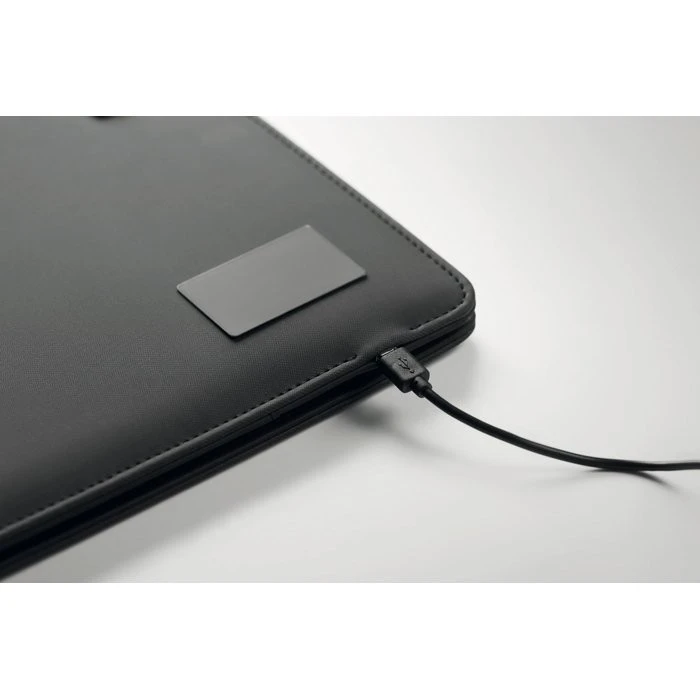 DIN A4 Portfolio mit Magnetverschluss. Integrierte induktive Ladestation DC5V/1A und 4000 mAh Powerbank. Inkl. Mikro-USB-Kabel/Typ C. 20seitiger Block. Smartphone-/Tablet Halterung. Kreditkarten Steckfächer. Mit schwarzer Aluminium Plakette für Ihr Logo. PU in Leinen-Optik.