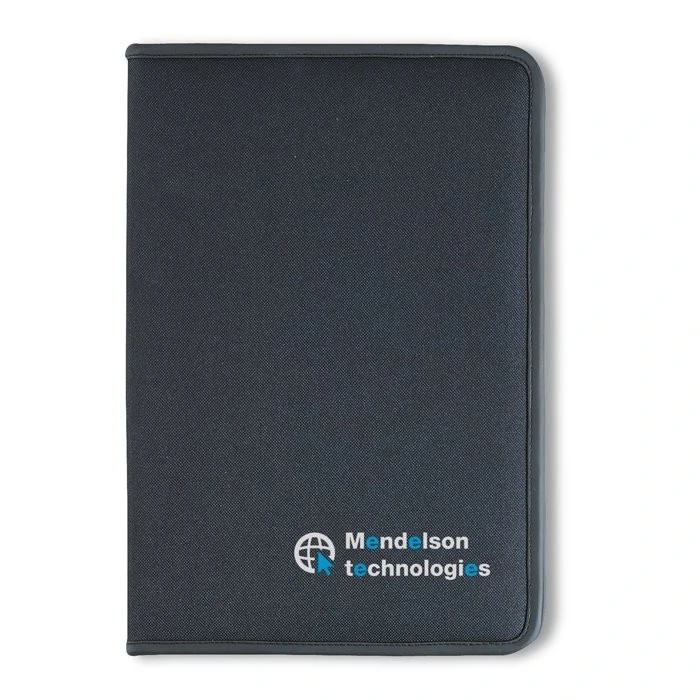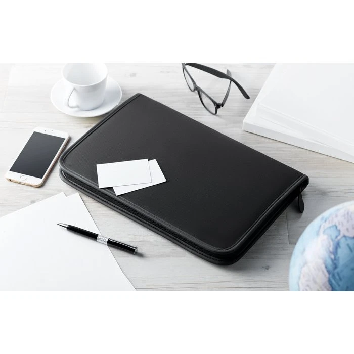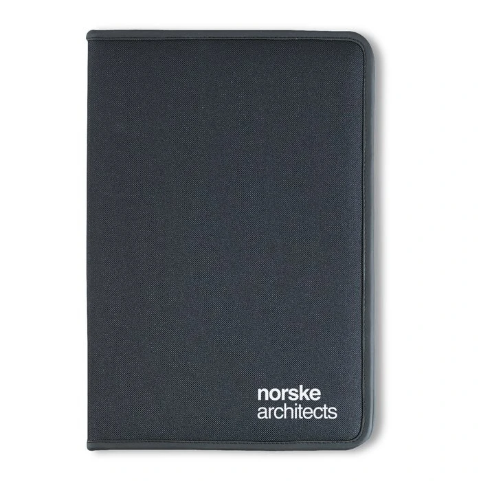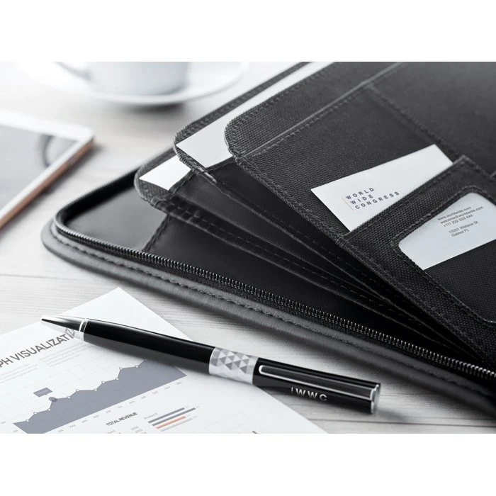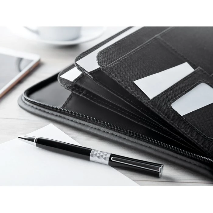DIN A4 Dokumententasche mit Reißverschluss. Diverse Fächer, auch für Visitenkarten. Inkl. 20-seitigem Block. 600D Polyester.