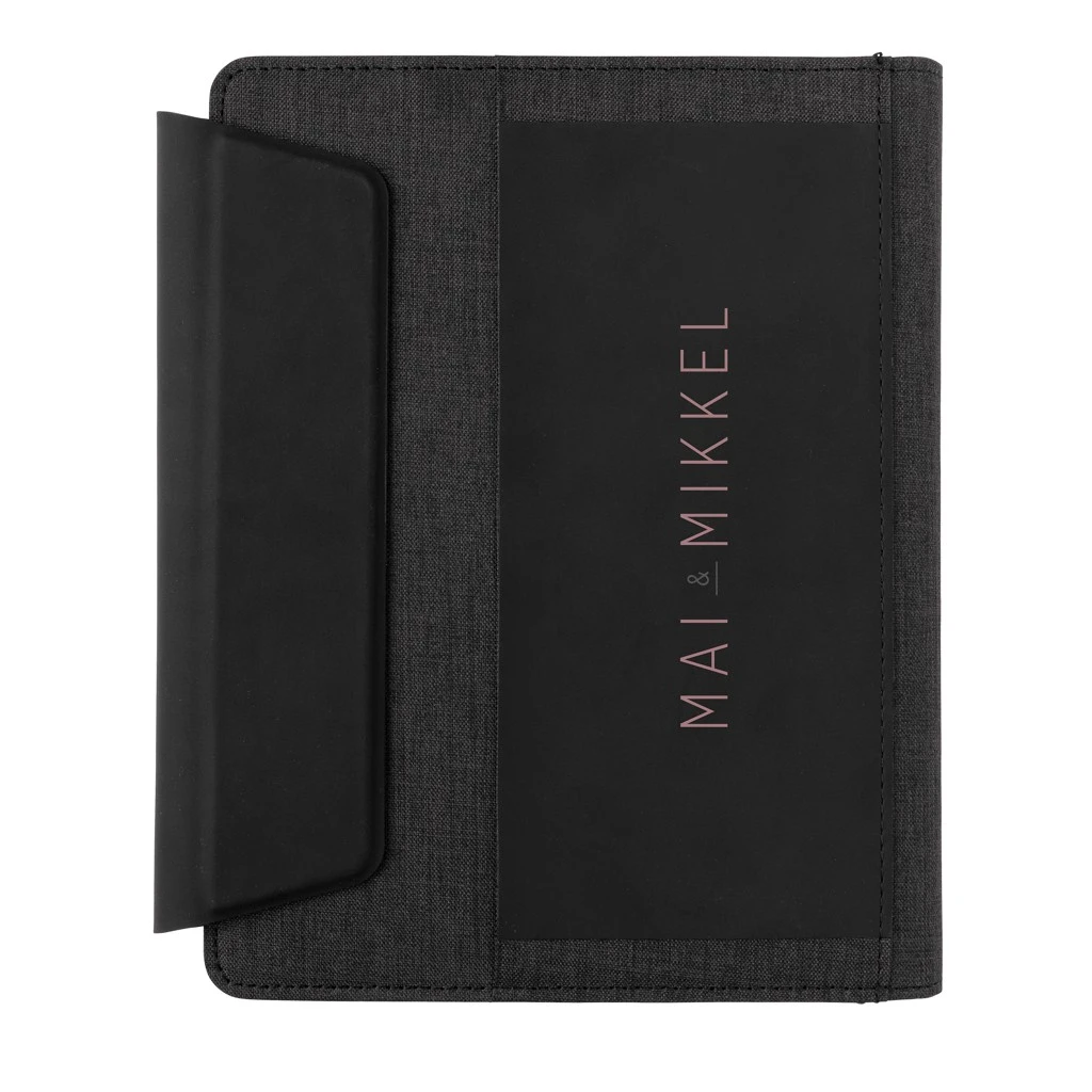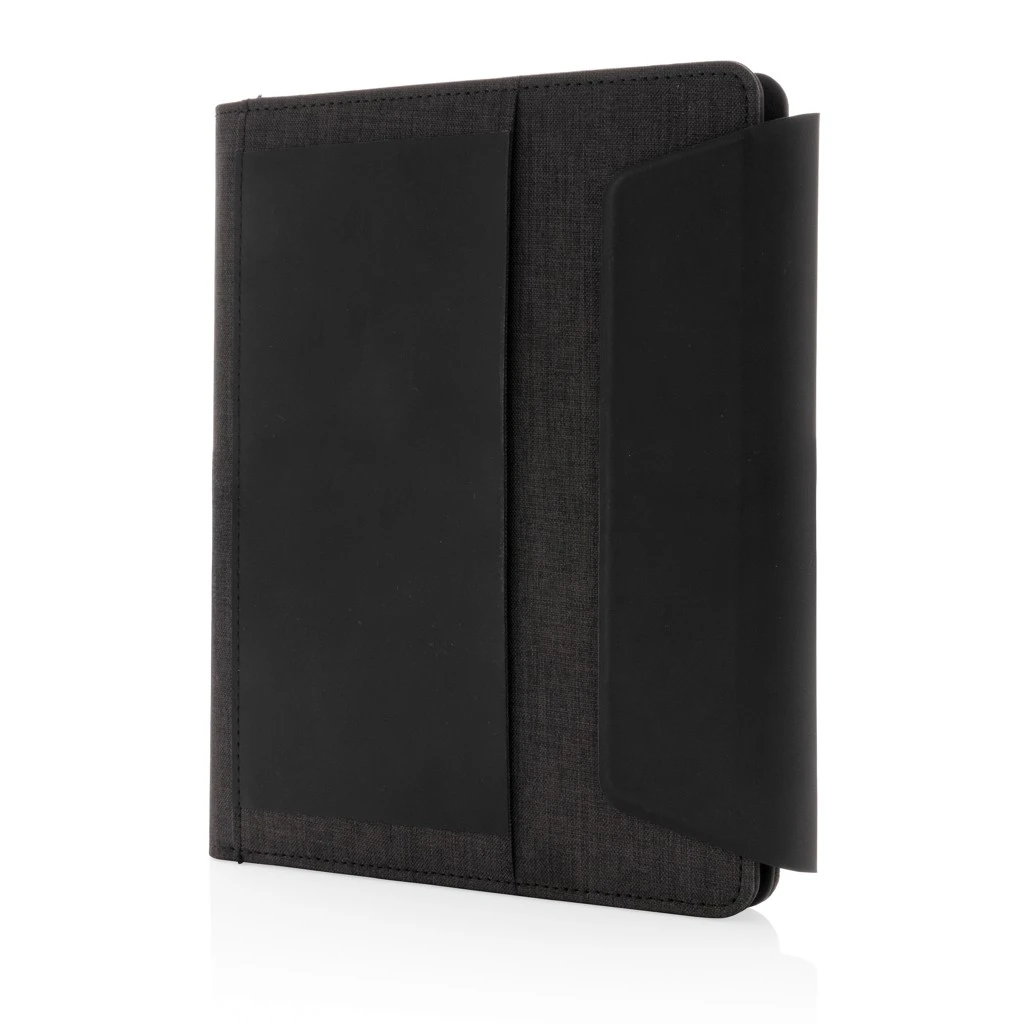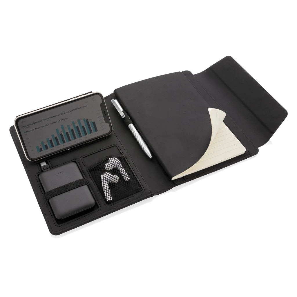 Schick und praktisch: Dieses A5 Portfolio mit integrierter Wireless Charging Funktion hat ebenso eine Powerbank die auch separat genutzt werden kann, sowie einen Wireless-Charging Telefonhalter, eine Stiftschlaufe weitere Netzfächer. Das Notizbuch hat 64 Blätter/128 Seiten Seiten 70gr cremefarbenes, liniertes Papier. Hergestellt aus einem Materialmix aus RPET und PU. Input: 5V/2A; Output:5V/2A. Wireless Input 5V/2A, Output 5V/1A. Verpackt in Geschenkbox