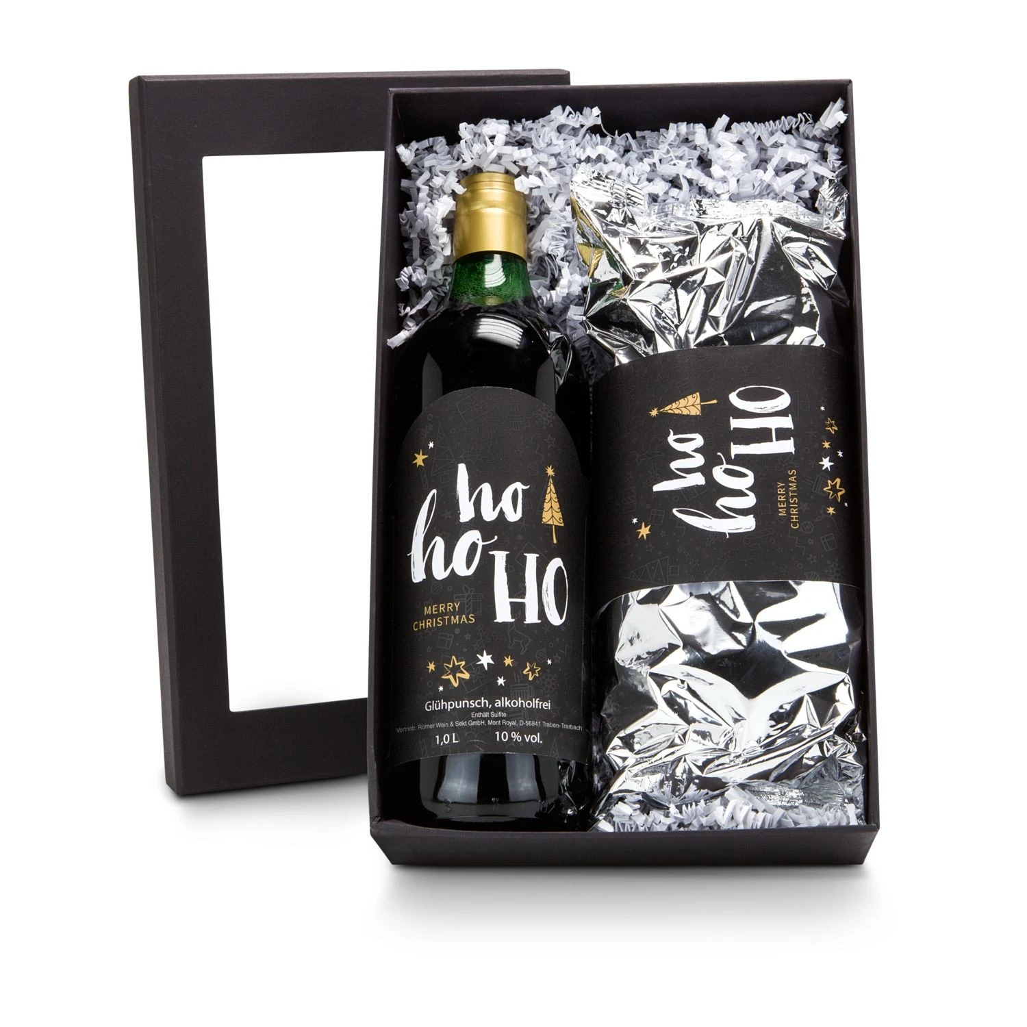 1 Glühpunsch (1 l, alkoholfrei) und 750 g Christstollen jeweils im festlichen Weihnachtsdesign verpackt im schwarzen Karton mit Sichtfenster