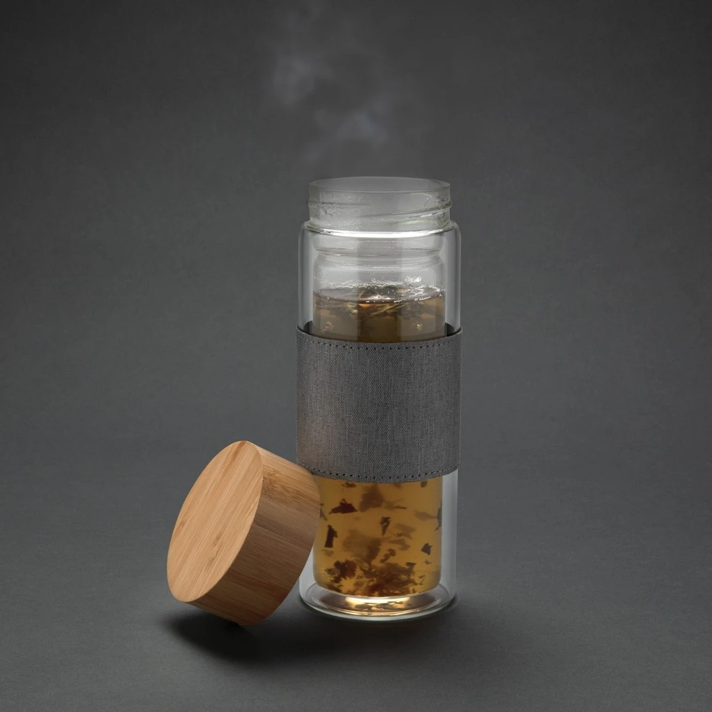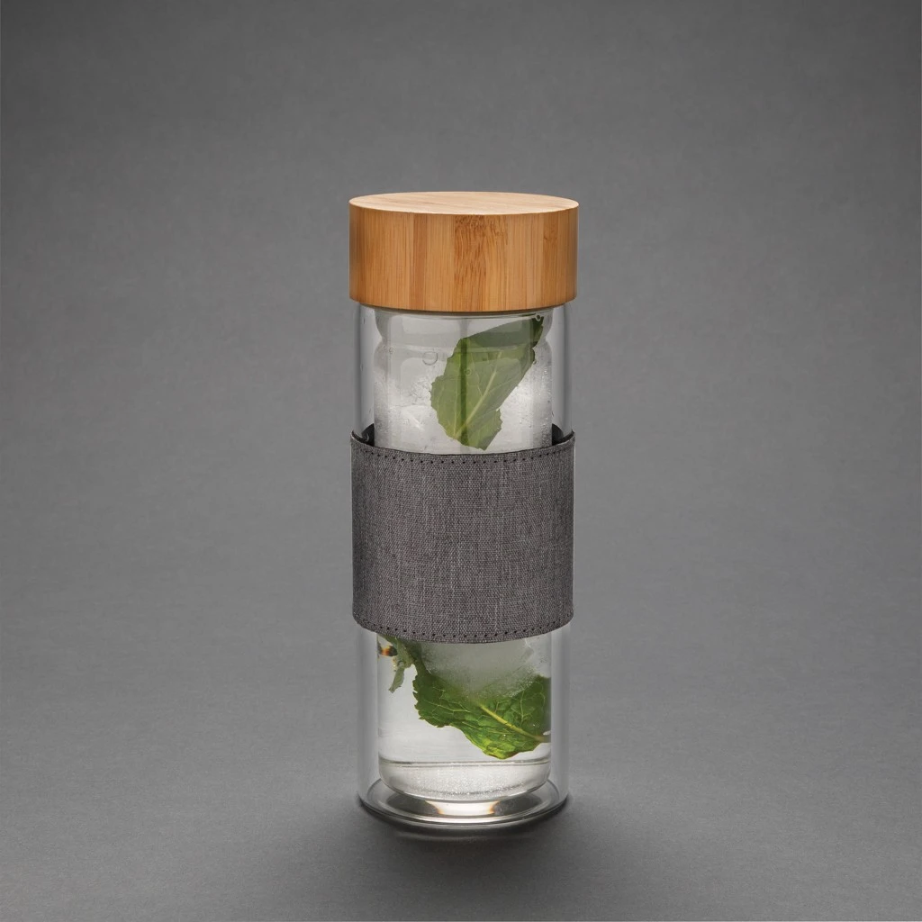 Glasflaschen bedeuten weniger Plastikmüll. Diese Flasche mit Bambusdeckel, hergestellt aus hochwertigem Borosilikatglas lässt Sie, da sie doppelwandig ist, nun auch heiße Getränke mitnehmen. Ein schickes Sleeve aus RPET komplettiert den Look. Kapzität 360ml. BPA frei.