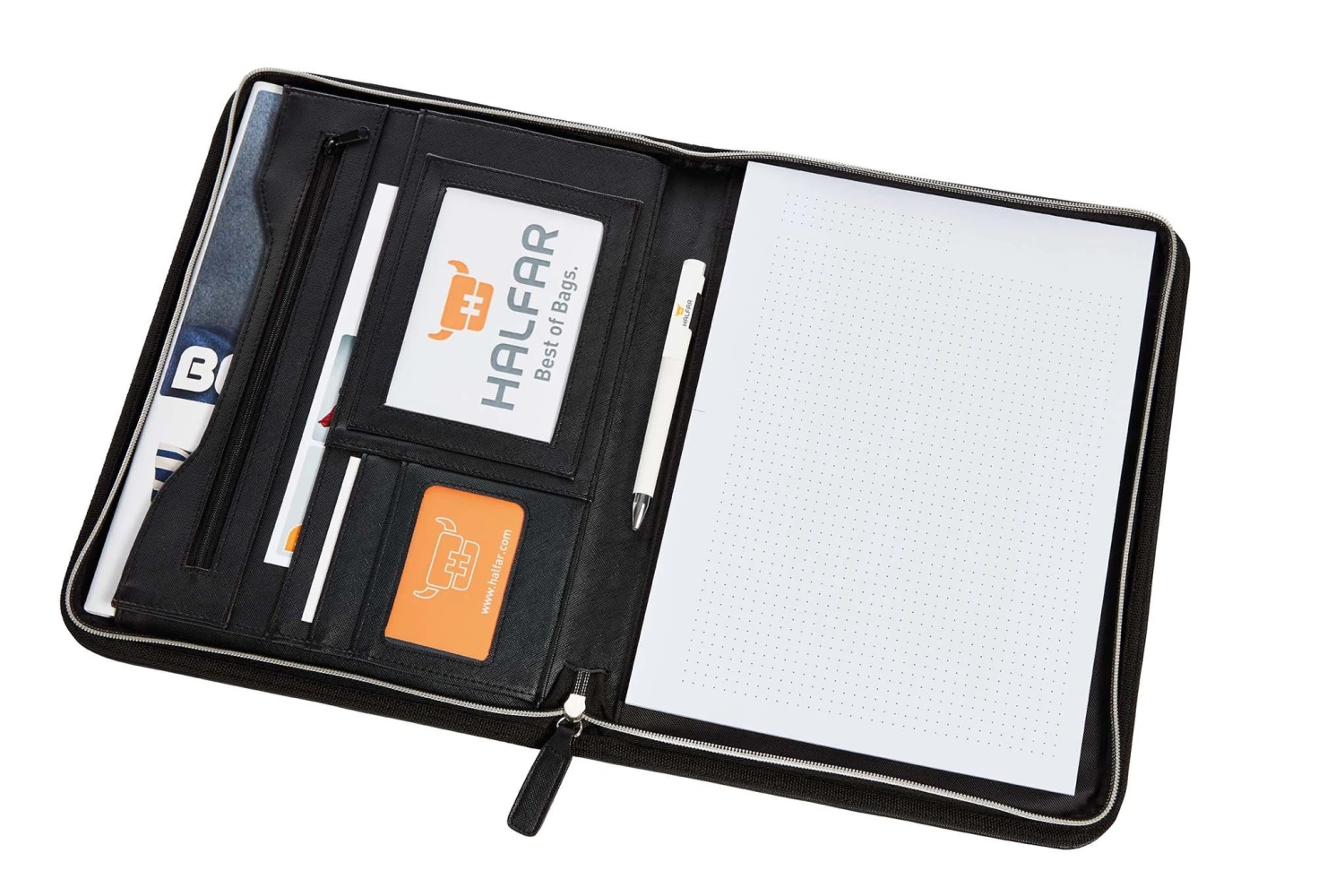 Schreibmappe mit Organizer-Elementen verschließbar mit Reißverschluss; diverse flache Einsteckfächer; Reißverschluss-Fach innen; Gummischlaufe für Kugelschreiber; inkl. Schreibblock