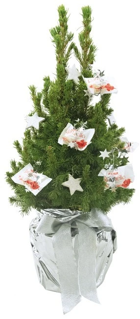 | Inhalt | Zuckerhutfichte 35 – 45 cm in Einzelversandverpackung, geschmückt mit 5 Raffaello (je 10 g) und 5 Gl |