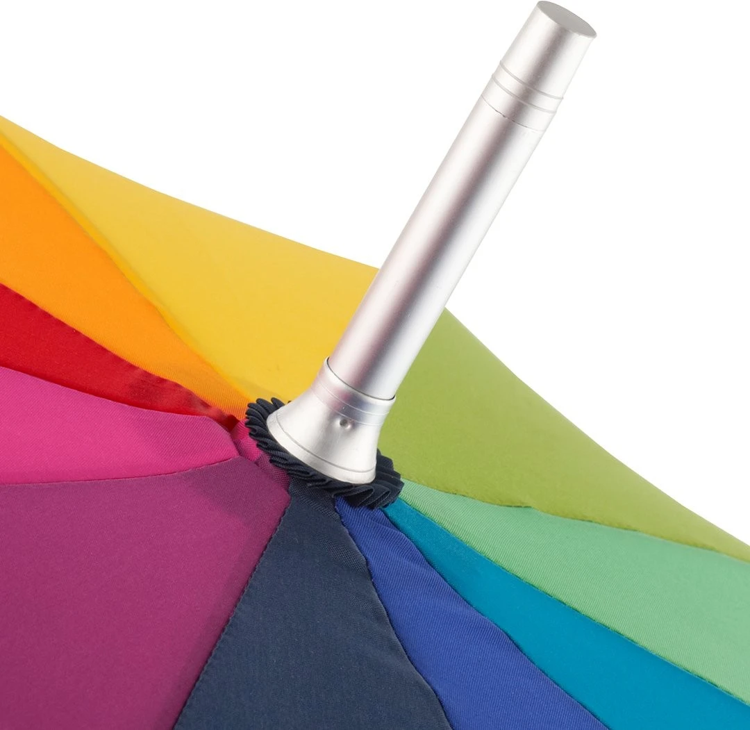 ?Einfache Handhabung durch Sicherheitsschieber, hochwertiges Windproof-System für eine maximale Gestell-Flexibilität bei stärkeren Windböen, flexible Fiberglasschienen, leichter Aluminiumstock, besondere Schirmform durch 10 Keile, schwarzer Soft-Touch-Rundhakengriff mit Werbeanbringungsmöglichkeit