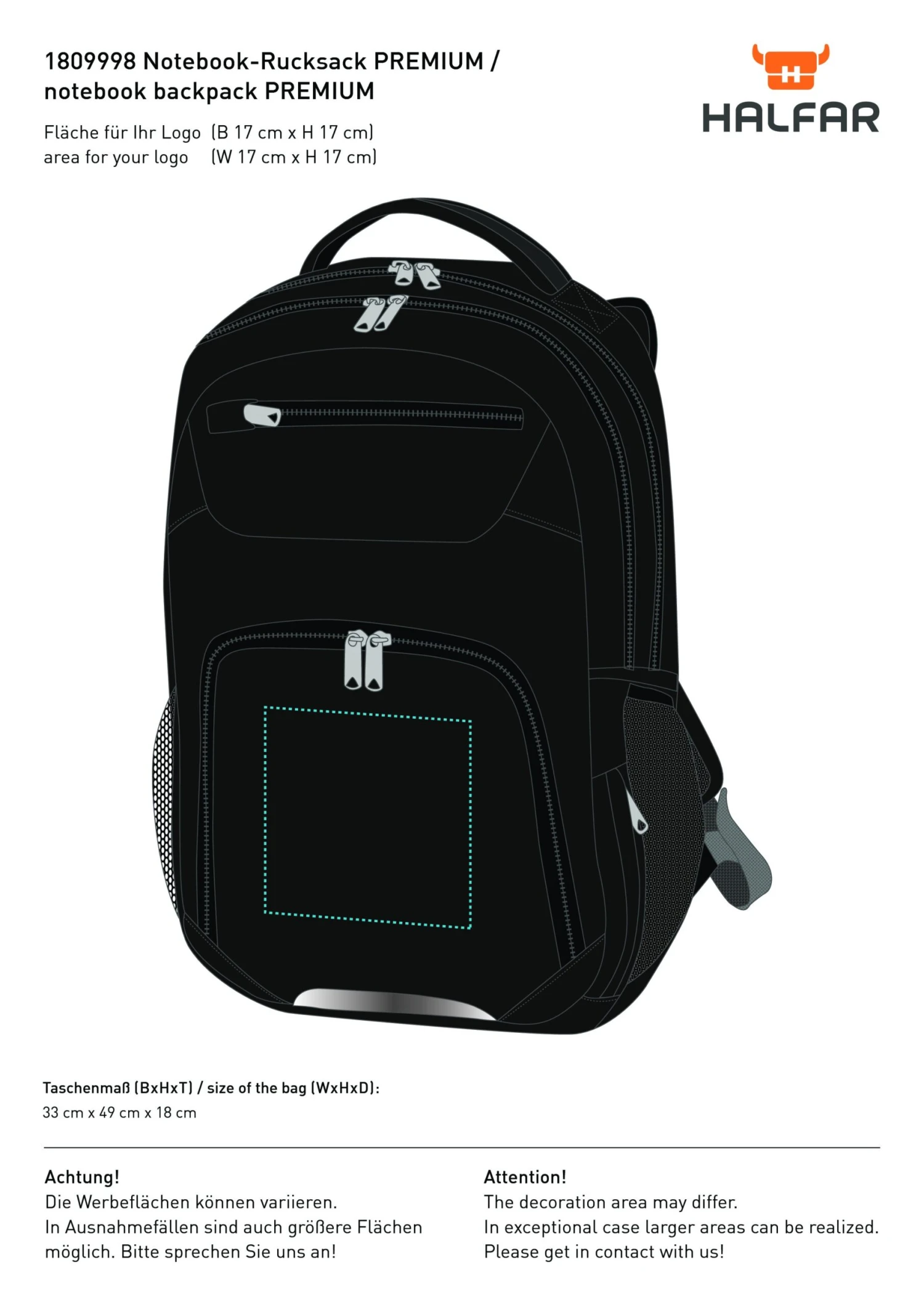 | Werbefläche | 15 x 15 cm (auf der Vortasche) |