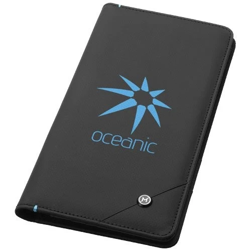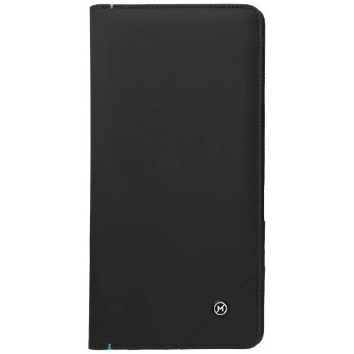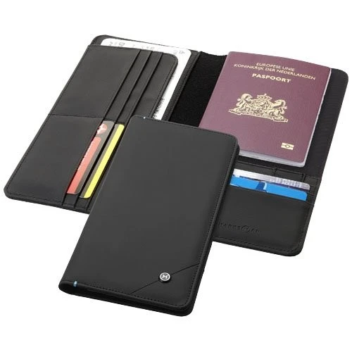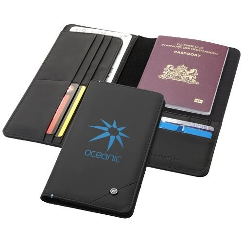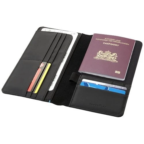 Odyssey RFID Reisebrieftasche. Kreditkarten, Pässe und andere Ausweise haben integrierte RFID Chips. Diese Reisebrieftasche im exklusiven Design enthält ein Innenfutter mit RFID Blockierung. Die Reisebrieftasche hat zehn Kreditkartenschlitze, zwei große Schlitztaschen, ein Fach für den Pass, eine Stiftschlaufe und ein SIM Kartenfach. Verpackt in einem Marksman Geschenkkarton. . Tarpaulin.