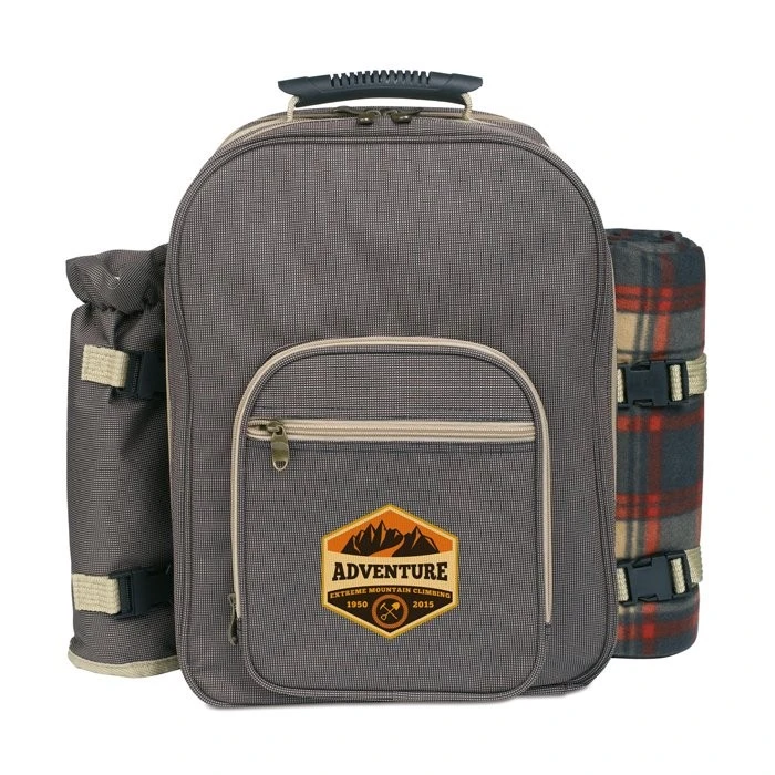 Hochwertiger Picknick Rucksack für 4 Personen. Inklusive Decke, Flaschenfach und edlem Tischzubehör. 600D Polyester.