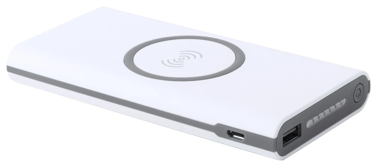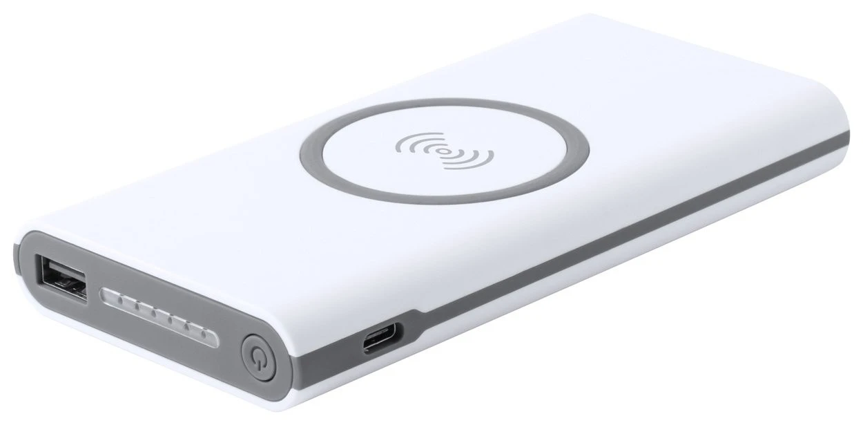 Powerbank mit integriertem kabellosem Ladegerät, USB und USB Typ-C Ladeports. Kapazität: 6000 mAh. Gehäuse aus Kunststoff. Das Aufladen erfoltg über den USB Typ-C Port. Exkl. Ladekabel.