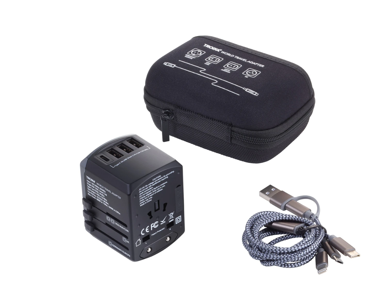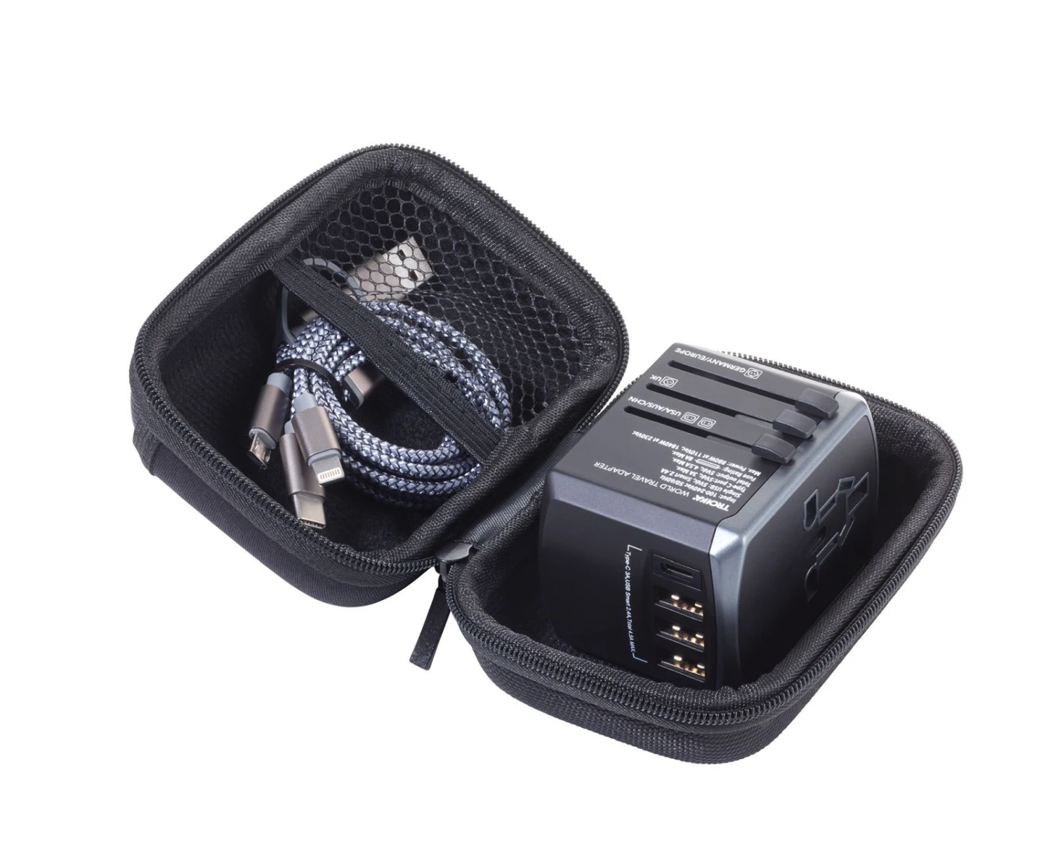 Reiseadapter-Set bestehend aus: universal Steckdosenadapter, 3 in 1 Ladekabel und Aufbewahrungsetui, Adapter geeignet für alle gängigen Steckdosen weltweit, Steckerkontakte durch herausschieben wählbar nach Region (USA/AUS/CHN/UK/GER/EU), 3 USB und 1 USB Typ C Anschluss für gleichzeitiges Laden von bis zu 4 elektronischen Geräten, mehrfach Sicherheitszertifiziert: CE, FC, RoHs, Ladespannung: 3A Typ C-, 2,4A bei USB-Buchse, eingebaute 8 Ampere Sicherung + Ersatzsicherung im Adapter beiliegend, Ladekabel: USB/USB-C auf Micro-USB/Lightning/Typ C, Kabel textilummantelt, 26 cm lang, Aufbewahrungsbox mit Netzabtrennung im Innenteil, ABS Kunststoff, Metall, Nylon, matt, grau/schwarz