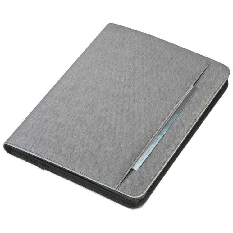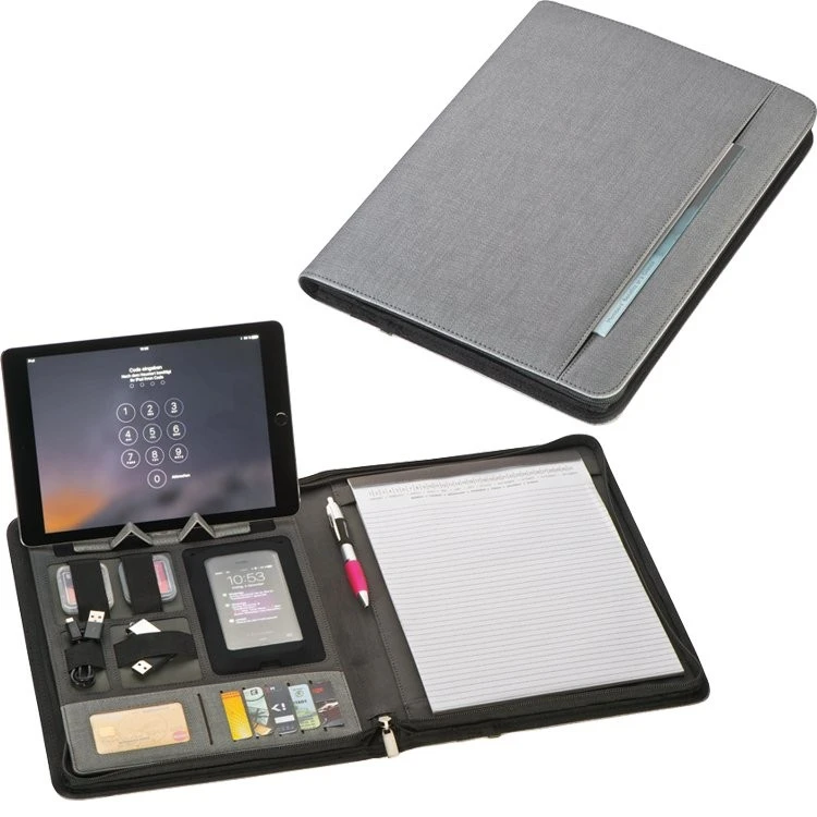 Schreibmappe aus Kunstleder DIN A4 inklusive Powerbank (Kapazität 5.000 mAh), USB-Ladekabel, 8 Einsteckfächern, Handyfach, Kugelschreiberschlaufe, Tablethalterung und Schreibblock. Ihre Werbung drucken wir außen auf die Schreibmappe.