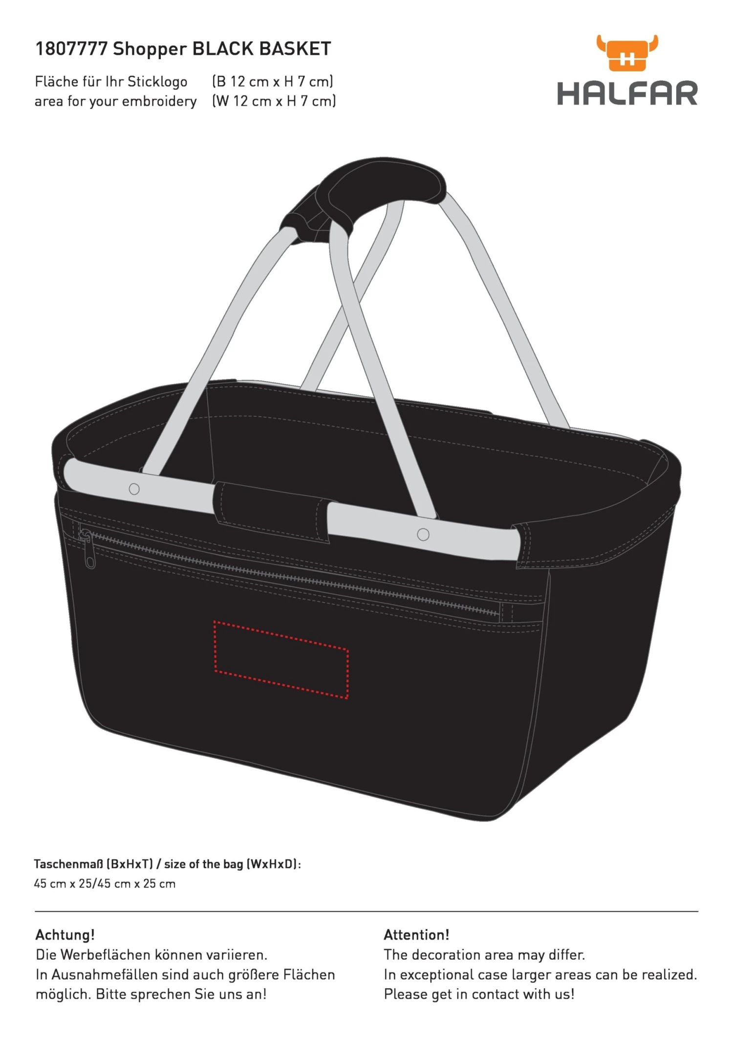 | Werbefläche | 25 x 10 cm (auf der Vortasche) |