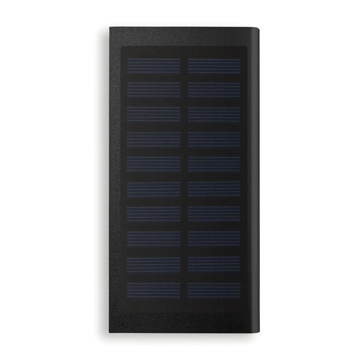 Powerbank 8000 mAh mit Solarfeld. Geeignet für den Betrieb von Smartphones. Mit Betriebsanzeigelicht und USB Kabel mit Mikro-USB-Anschluss. Ausgangsstrom DC5V/1A. Gehäuse aus Aluminium.