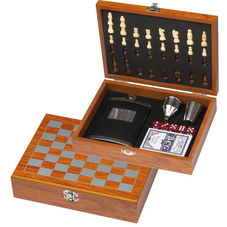 Spieleset mit Flachmann, Schach- und Kartenspiel