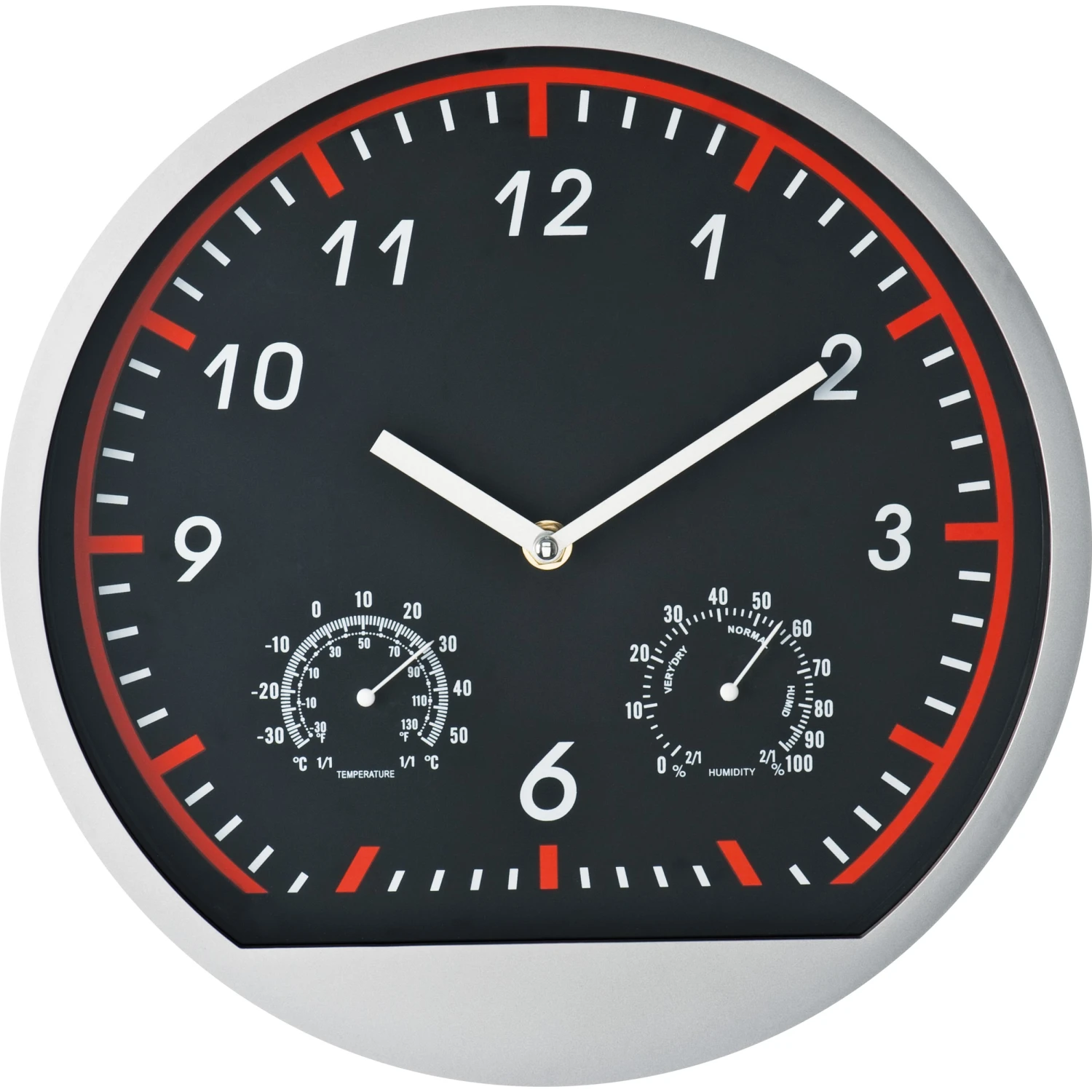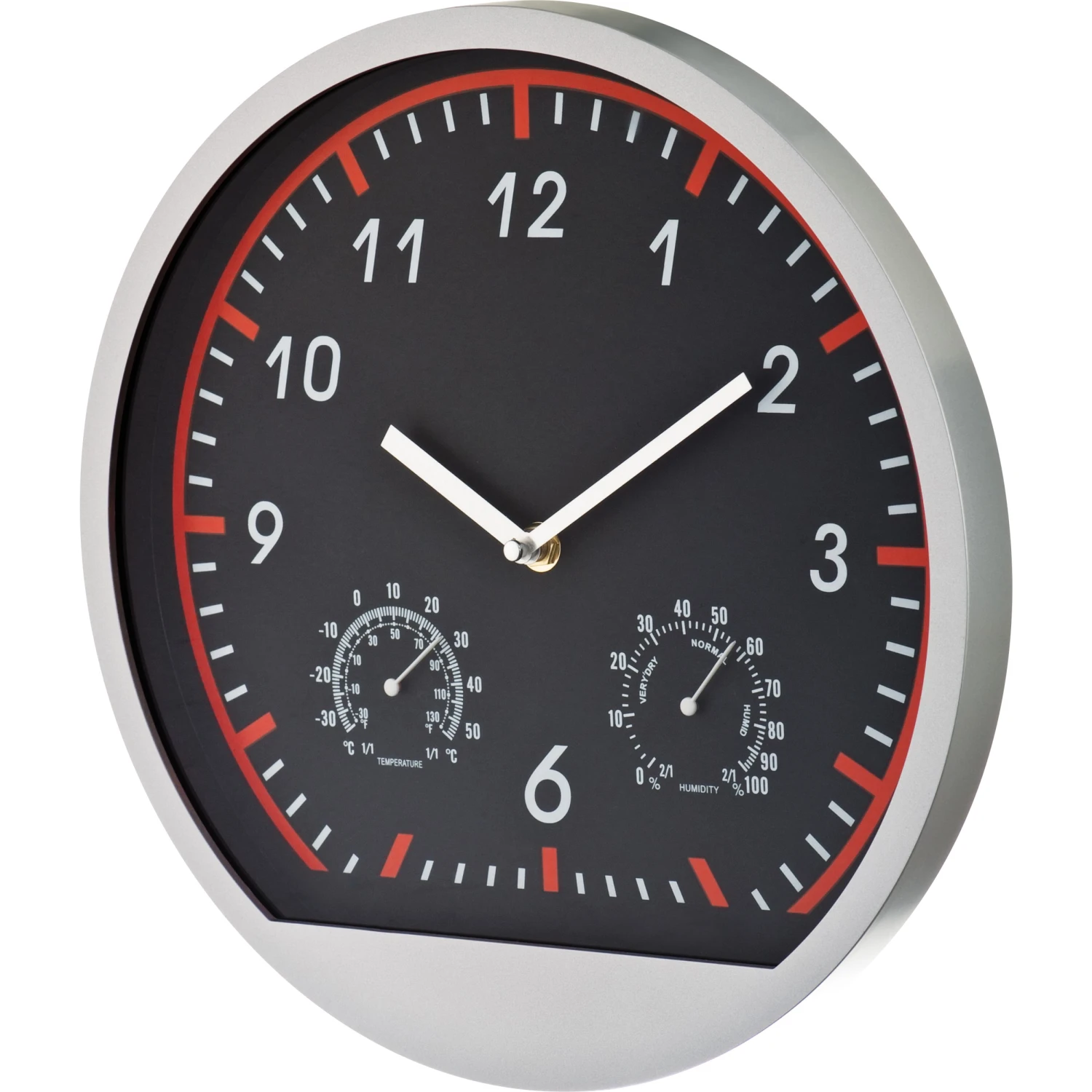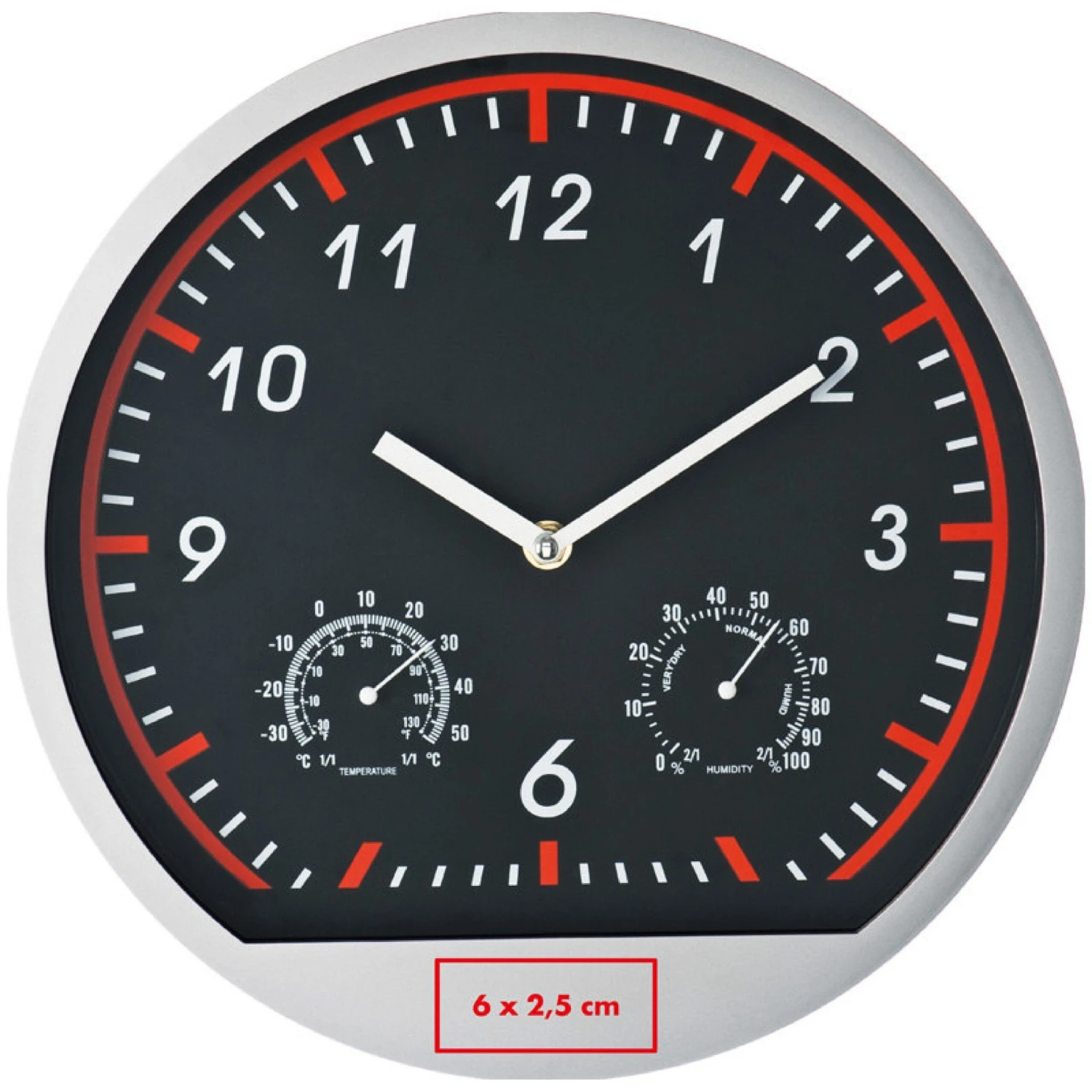 Wanduhr im coolen Sportdesign. Haben Sie nur ein kleines Budget und suchen trotzdem nach einer schicken Wanduhr? Dann sind Sie hier genau richtig. Die tolle Kunststoffuhr verfügt ebenfalls noch über ein Thermo- und ein Hygrometer. Ihre Werbung drucken wir unterhalb der 6 auf den Rahmen. Exklusive einer AA Batterie, bestellen Sie diese gleich mit (siehe letzte Seite). Einzeln verpackt im Karton.