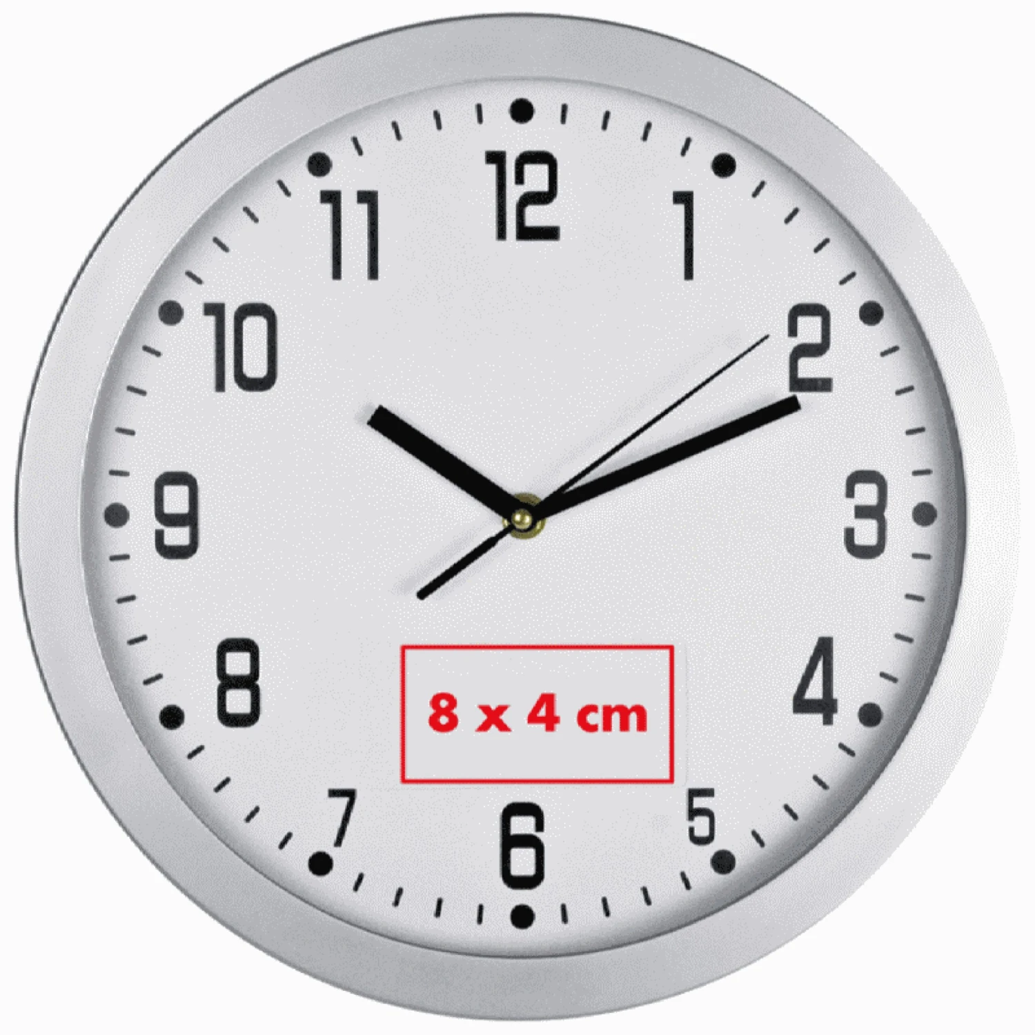 Ideale Wanduhr mit perfekter Lösung zur Bedruckung direkt auf dem Zifferblatt. Kein Auseinanderschrauben der Uhr nötig. Ihre Werbung wird auf das von hinten leicht entnehmbare Plättchen gedruckt.