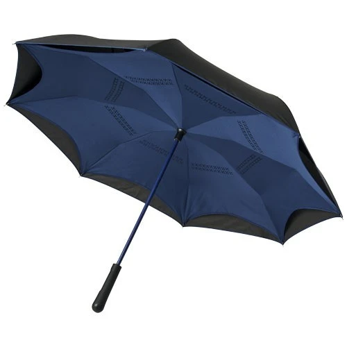 Yoon 23 umkehrbarer farbiger gerader Regenschirm. 23 Zoll zusammenklappbarer Wende-Regenschirm in frischen Farben. Öffnet und schließt verkehrt herum, dies macht es einfacher, ihn beim Ein- und Aussteigen in ein Auto zu verwenden, da das Wasser innen und die äußere Oberfläche trocken bleibt. Der Regenschirm kann alleine stehen, wenn er geschlossen ist, sodass das Wasser zum Trocknen ablaufen kann. Windfestes Gestell mit Fiberglas-Speichen und Schaft. Manuelle Öffnung mit einem Druckknopf, einklemmsicherer Schieber und doppellagige Polyester-Plane. Die innere Haube und die Paspelierung auf der äußeren Haube sind farblich abgestimmt, sowohl mit dem Glasfaserschaft als auch mit dem Druckknopf. Große Dekorationsfläche auf jedem Paneel verfügbar. Polyesterseide.